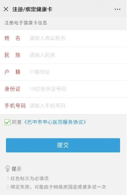 1、线上建卡:关注“巴中市中心医院”微信公众号→点击个人中心→选择电子健康卡→实名制注册→即完成申领