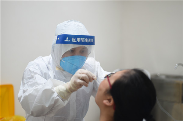 工作服、防护服、手套、鞋套、防护面屏、口罩,医生全副武装为患者采集咽拭子标本。