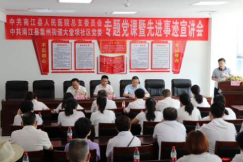 开展一次主题党日活动。与集州街道大堂坝社区联合开展专题党课暨先进事迹宣讲会、走访社区老党员和困难群众、为社区群众义诊、清扫社区街道等“共驻、共建、共享”主题活动,让党员同志走进社区、了解社区,参与社区治理工作,实现医院党组织和社区党组织资源共享、优势互补、良性互动,全面推进社区治理和治理能力现代化建设。