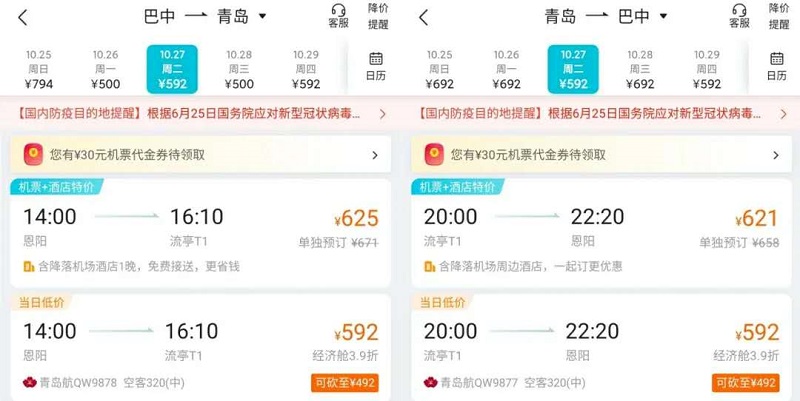 据了解,航班号为青岛航QW9878,空客320(中)执飞。巴中→青岛,14:00从巴中恩阳机场起飞,16:10抵达青岛流亭机场T1。青岛→巴中,20:00从青岛流亭机场T1起飞,22:20抵达巴中恩阳机场。