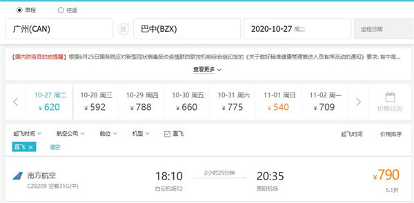 据了解,航班号为南方航空CZ8210,空客320(中)执飞。巴中→广州,21:25从巴中恩阳机场起飞,23:40抵达广州白云国际机场T2。广州→巴中,18:10从广州白云国际机场T2起飞,20:35抵达巴中恩阳机场。(图据去哪儿网站)