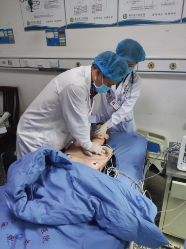 现场模拟了一位女士刚接种新冠疫苗后观察期间,出现全身皮疹,后过敏症状逐渐加重,出现严重的过敏性休克合并急性喉头水肿,最后出现呼吸心跳骤停;在场人员马上报告医疗救治保障医生,医生检查后,根据严重过敏反应不同层级对其开展对应层级的现场急救,尤其是肾上腺素在不同分级中的用法,采取开放气道、心肺复苏、气管插管、环甲膜穿刺术、简易呼吸球囊辅助呼吸等一系列急救操作,该受种者病情趋向稳定后送至重症医学科进一步救治。整个演练过程有条不紊,医护人员判断准确,抢救措施处理到位。