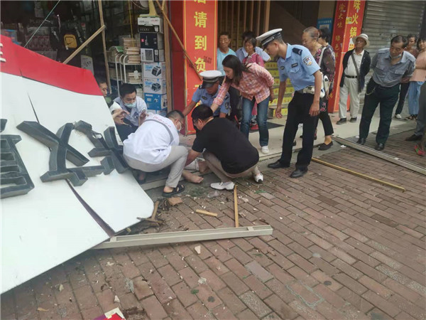 “当时,我立即冲过去移开广告牌,然后又有一位热心市民和伤者家属过来帮忙。”杨耀告诉记者,“我们把近百斤的广告牌移开后,就拉着伤者的手准备往外拖移,但伤者觉得痛,我才看到伤者的左腿明显骨折,头部已经开始大量流血。”