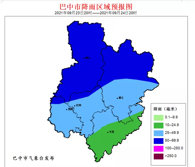 四川新闻网消息(记者 张韵晗)9月23日16时,巴中市气象台发布暴雨蓝色预警。据最新气象资料分析,预计23日夜间至24日白天巴中市将有一次强降雨天气过程,南江县暴雨,通江县大雨到暴雨,其余县区中雨到大雨,个别地方暴雨。