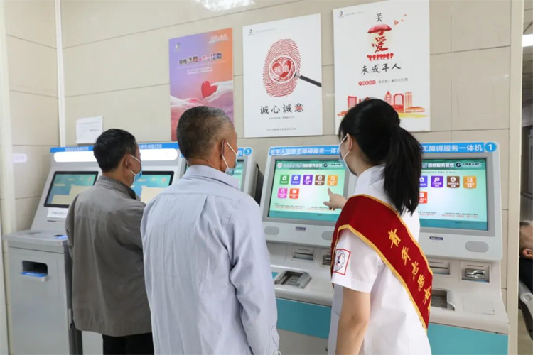 近年来,巴中市中医院为解决老年人在运用智能技术方面遇到的困难,坚持人工服务与智能化服务并行的方式,大力开展老年人信息无障碍建设,提高老年人就医体验。针对老年群体听力减退,行动不便的问题,专门配置了带语音功能的信息无障碍服务一体机、智能导诊台、检验检查报告自助打印机,方便老年患者自主使用。