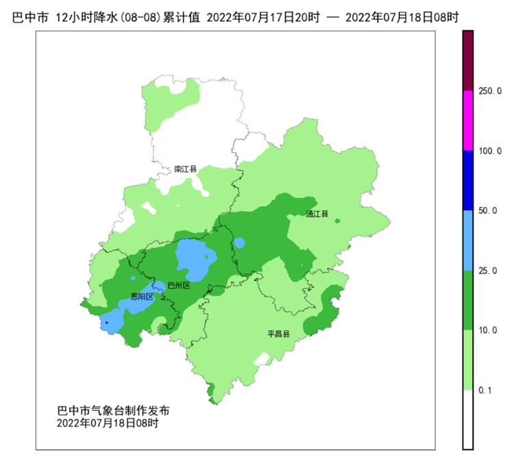 据了解,7月17日20时至18日8时,巴中市普降小到中雨,局部大到暴雨。全市共17站雨量超过25毫米,1站雨量超过50毫米,为恩阳区下八庙50.8毫米。各城区雨量分别为:巴州区22.8、恩阳区26、经开区37.3、南江县0、通江县10.4、平昌县2.3(单位:毫米)。预计未来36小时暴雨到大暴雨。
