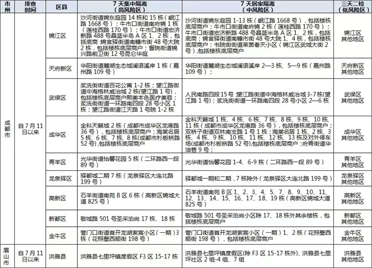 对7月11日以后有成都市、眉山市中风险区旅居史的来(返)巴人员,采取7天居家隔离医学观察,在居家隔离第1、4、7天各开展一次核酸检测;如不具备居家隔离医学观察条件,采取集中隔离医学观察;管理期限自离开风险区域算起。