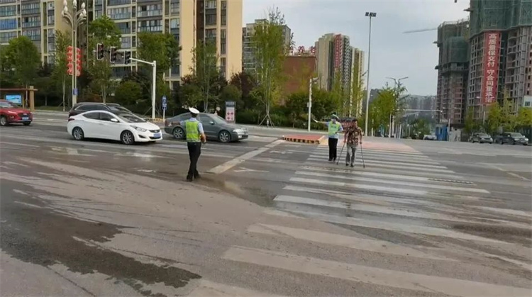 8月2日上午9时许,巴中公安交警直属三大队交警在经开区体育馆路口开展路面执勤工作,一名杵着拐杖的老人在横过斑马线时,由于腿脚不便行动迟缓,随即,执勤交警从执勤点赶紧走到老人面前将老人安全护送到马路对面的安全区域。