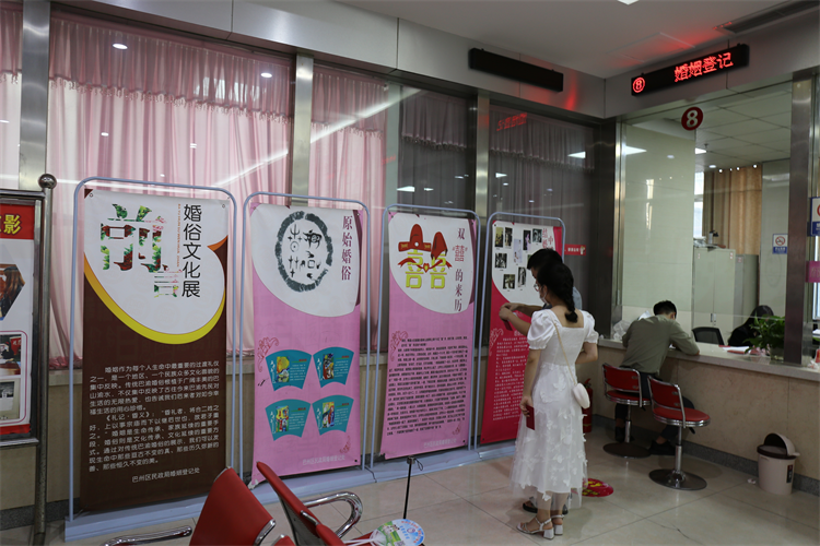 巴州区民政局婚姻登记处开展了“抵制高价彩礼,倡导文明新风”宣传活动。现场,工作人员向新人发放了“文明婚俗新风倡议书”宣传单、视频滚动播放了文明婚俗宣传片、设置了婚俗文化展。此外,还邀请了社工师在现场开展婚姻家庭辅导。