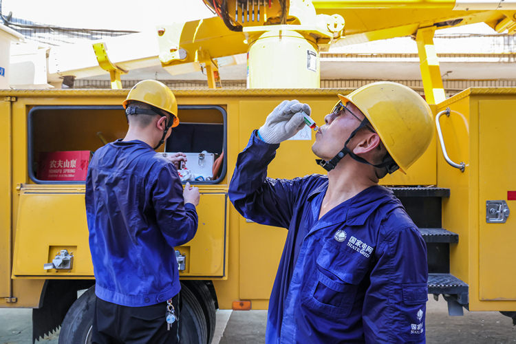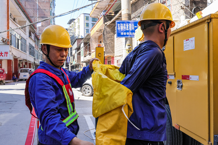 一切准备就绪,“全副武装”的检修人员缓缓向作业点靠近,他们在10多米高空的作业斗内,谨慎专注地做好绝缘防护、更换“发热”设备——一道道作业流程严谨有序。经过近1小时的连续作战,密不透风的绝缘服下,作业人员的衣服早已汗水湿透。