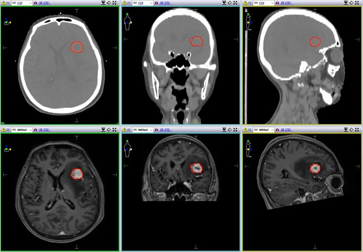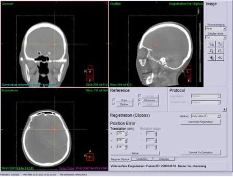 每次治疗前通过锥形束CT(Cone beam CT,CBCT)进行影像验证,医师、物理师、技师共同参与摆位、验证及治疗,肿瘤位置误差被控制在1mm以内,在肿瘤受到高剂量照射的同时,更好的保护了周围正常脑组织。