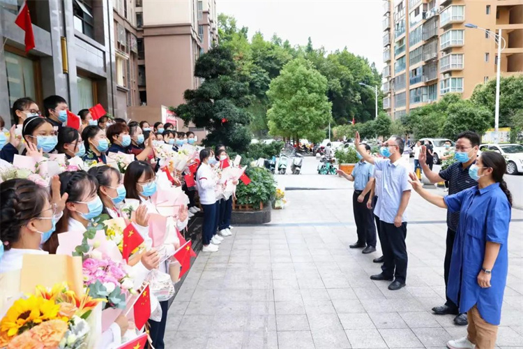 四川新闻网消息 9月21日,巴中市中医院43名援外医疗队员顺利解除集中隔离,院党委书记苟中富,党委副书记、院长李绍军率领院领导班子成员及相关科室负责人一行,在隔离酒店门前举办了简单而隆重的欢迎仪式,迎接英雄回家,并向他们致以崇高敬意和诚挚慰问!