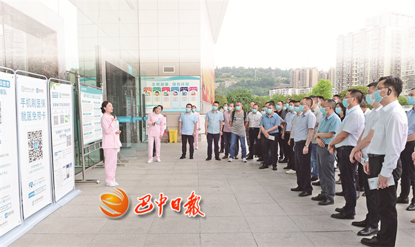 5月18日,全市医保电子凭证应用和移动支付建设现场推进会上,与会人员在市中心医院南坝院区观摩学习