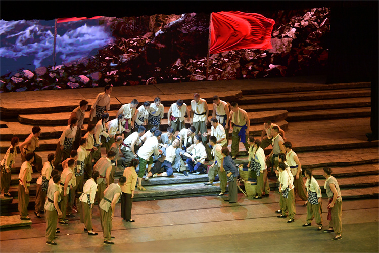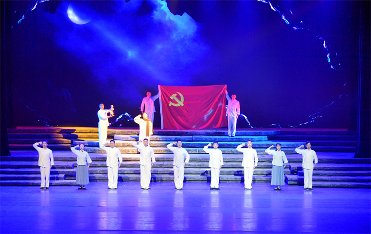 虽然被称之为曲艺音乐剧,但作者在结构这部戏剧之时,却采用了话剧常用的倒叙回溯、串珠式叙事方法,配合曲艺唱、叙互动的表现形式。面对这位有76年党龄的主人公丰富的人生历程和难以尽述的相关事件,作者撷取了周永开漫长而不平凡的一生中,那些在不同时代最能体现一个共产党人优秀品质的故事,以此塑造了一个不同以往的共产党员的舞台艺术形象。他在白色恐怖之中毅然加入共产党;在敌人垂死挣扎的解放前夕,作为地下党县委书记前往敌军司令部动员重兵在握的敌军师长投诚起义,面临敌特阻挠、生死之危,他沉着应对、斗智斗勇,终于迎来了巴中县的和平解放。对于这段不平凡的经历,作者采用了点线结合的表现方式,简洁地勾勒出一个老共产党员周永开的历史贡献。对于主人公在新中国70年所经历的头绪纷繁的历史事件和生活故事,作者巧妙地将人物和事件置放于重大政治历史背景和当地具体环境之中,以重大事件的宏观叙事与具体生活细小事件互为补充,营造出一出出真实可信、感人至深的戏剧场景。在生活最困难时期,作为水库修建的总指挥,周永开和社员们一同奋战在施工现场,同拉石头同挖土方。休息时,周书记拿出了一道“硬菜”——一袋干胡豆,分发给社员们“打幺台”。这是他从自己嘴里省下来的仅有的粮食。就是这一点今天看来微不足道的“硬菜”,不仅感动着修水库的社员,剧场中观众也无不为之动容。此情此景,还有什么举动、什么语言更能表达一个共产党员对群众的关切之情呢。
